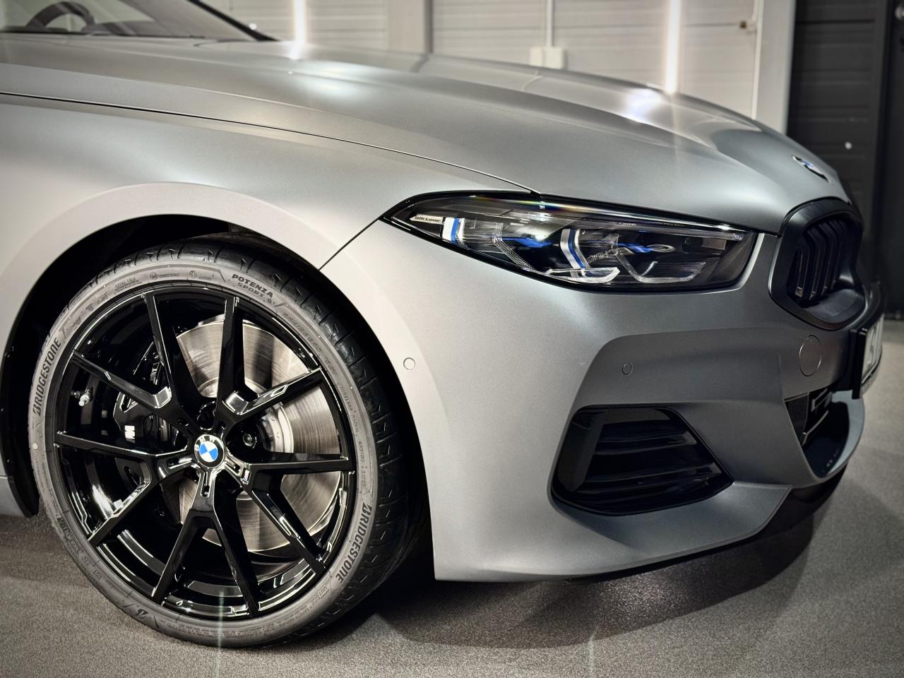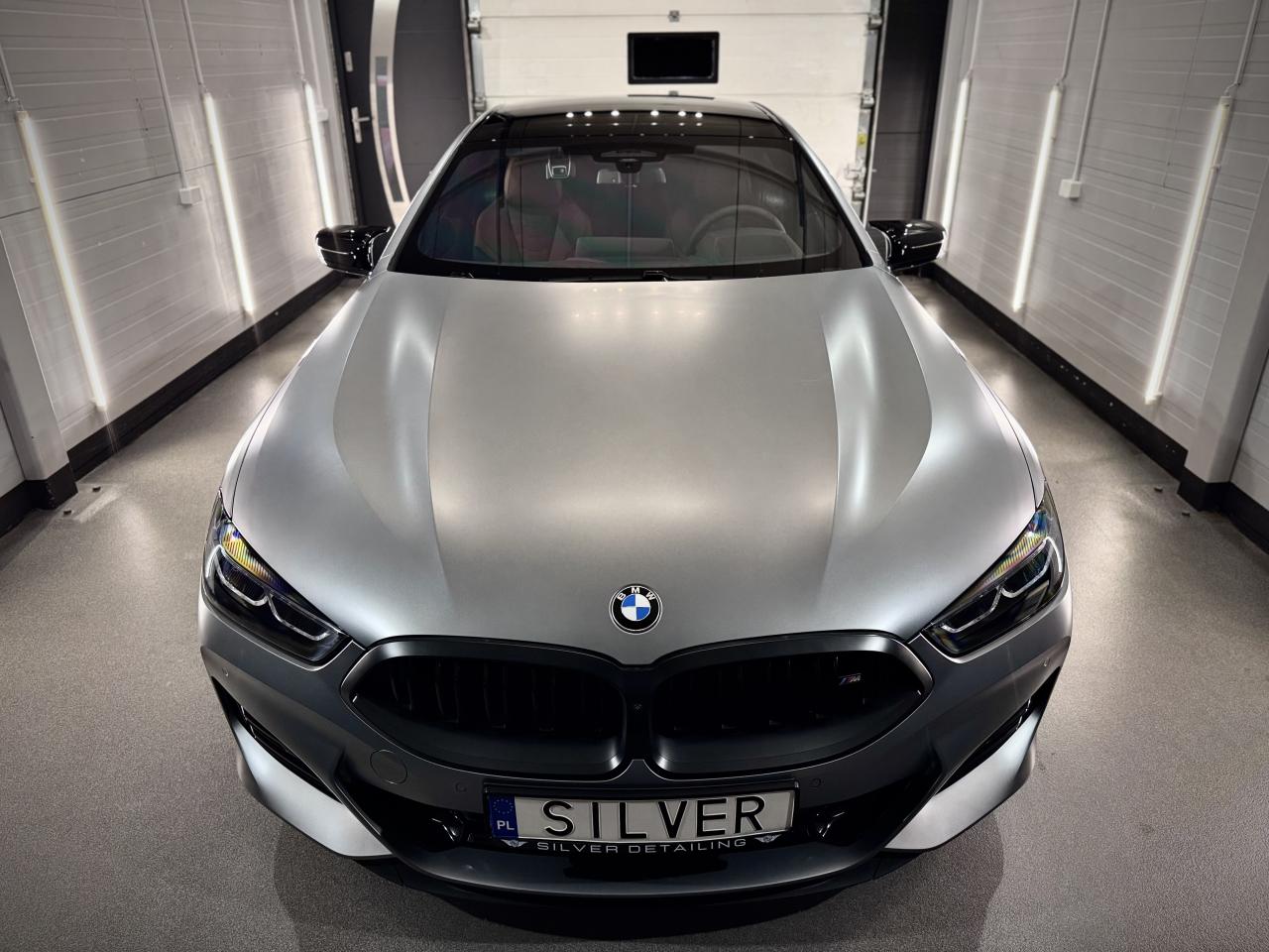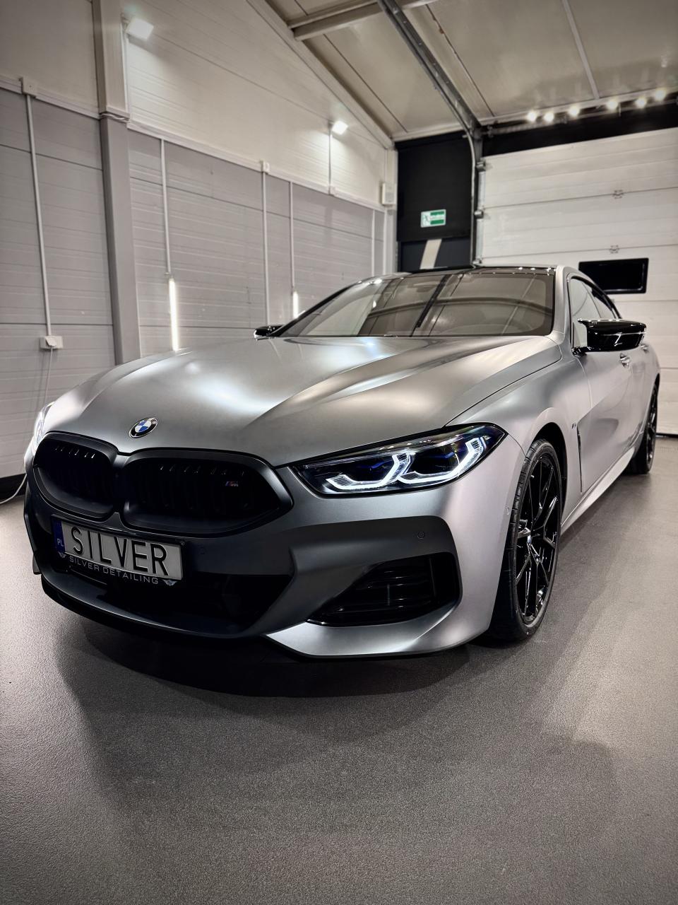 BMW 850 po pełnym oklejeniu w Silver Detailing – matowa folia PPF, szyba w folii WPS i wnętrze zabezpieczone w każdym detalu. Luksus, styl i ochrona w jednym.